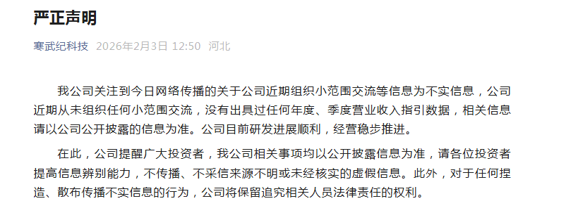 值得注意的是,当日午后,寒武纪微信公众号发布“严正声明”称,公司关注到今日网络传播的关于公司近期组织小范围交流等信息为不实信息,公司近期从未组织任何小范围交流,没有出具过任何年度、季度营业收入指引数据,相关信息请以公司公开披露的信息为准。公司目前研发进展顺利,经营稳步推进。