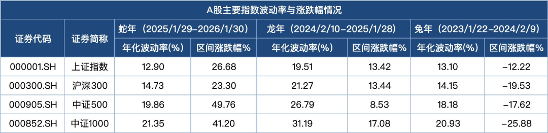 A股在蛇年期间,不仅呈现出慢牛行情,而且涨势也更加平稳。较上一农历年份比较,蛇年期间A股主要指数的波动率显著降低。在收益率较高且波动率偏低的情形下,投资者的持有体验明显改善,投资获得感与安全感显著增强。