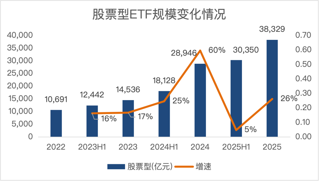 股票型ETF作为长期资金的代表之一,其规模连续维持正增长。截至2025年底,股票型ETF规模已达3.83万亿元,较上一年末相比增长32%。