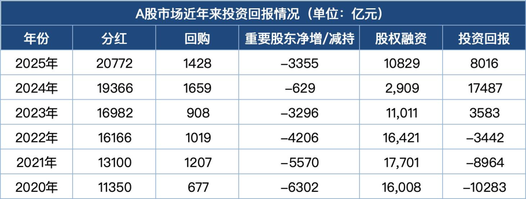 在政策的持续引导和支持下,A股上市公司着力提升股东回报,2025年A股上市公司分红创下历史新高。A股也逐渐从过往人们所说的融资市场转变为回报市场,上市公司连续三年向投资者贡献正现金流。