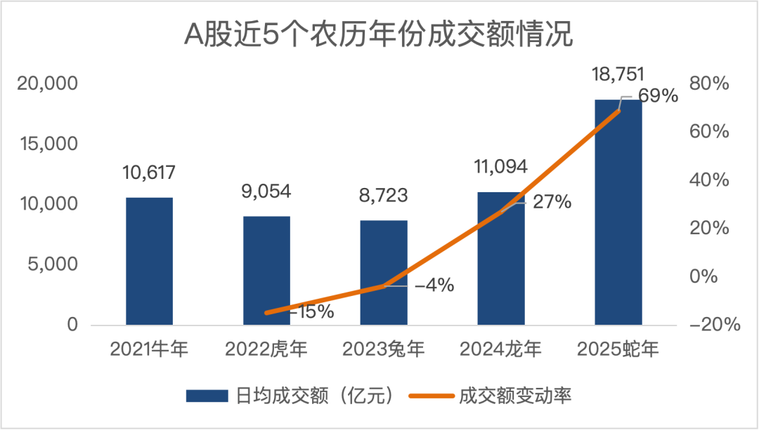 市场投资交易逐步活跃,A股成交量持续走高。截至2026年1月30日,在蛇年已有的245个交易日里,A股日均成交额高达1.875万亿元,同比上一农历年份增长69%,日均成交额刷新历史新高。