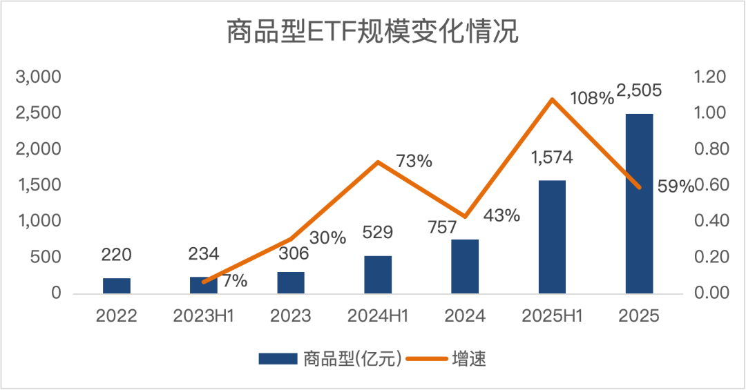 黄金、白银等贵金属以及铜、碳酸锂等有色工业金属都在蛇年间迎来了需求大爆发,价格持续走高。A股市场中的商品ETF底层资产绝大多数都是黄金,因此商品型ETF的规模也在黄金价格上涨的带动下持续走高。截至2025年底,商品型的规模已达2505亿元,规模较2024年底增长120%。