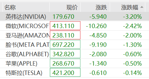 科技股多数下挫,美股科技七巨头全员飘绿,英伟达跌超3%,较前一交易日收盘时4.51万亿美元市值,市值蒸发超1500亿美元。微软、亚马逊跌超2%。闪迪跌近2%,美光科技跌近5%。