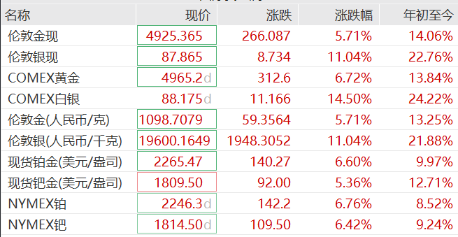 贵金属方面,2月3日,黄金白银强势反弹,现货黄金大涨超5%,站上4900美元;现货白银大涨超11%,完全收复昨日的跌幅,报87.86美元。受此影响,美股贵金属板块强势拉升,南方铜业涨超7%,麦克莫兰铜金、First Majestic Silver涨超5%,泛美白银涨涨超4%,纽曼矿业涨超3%。