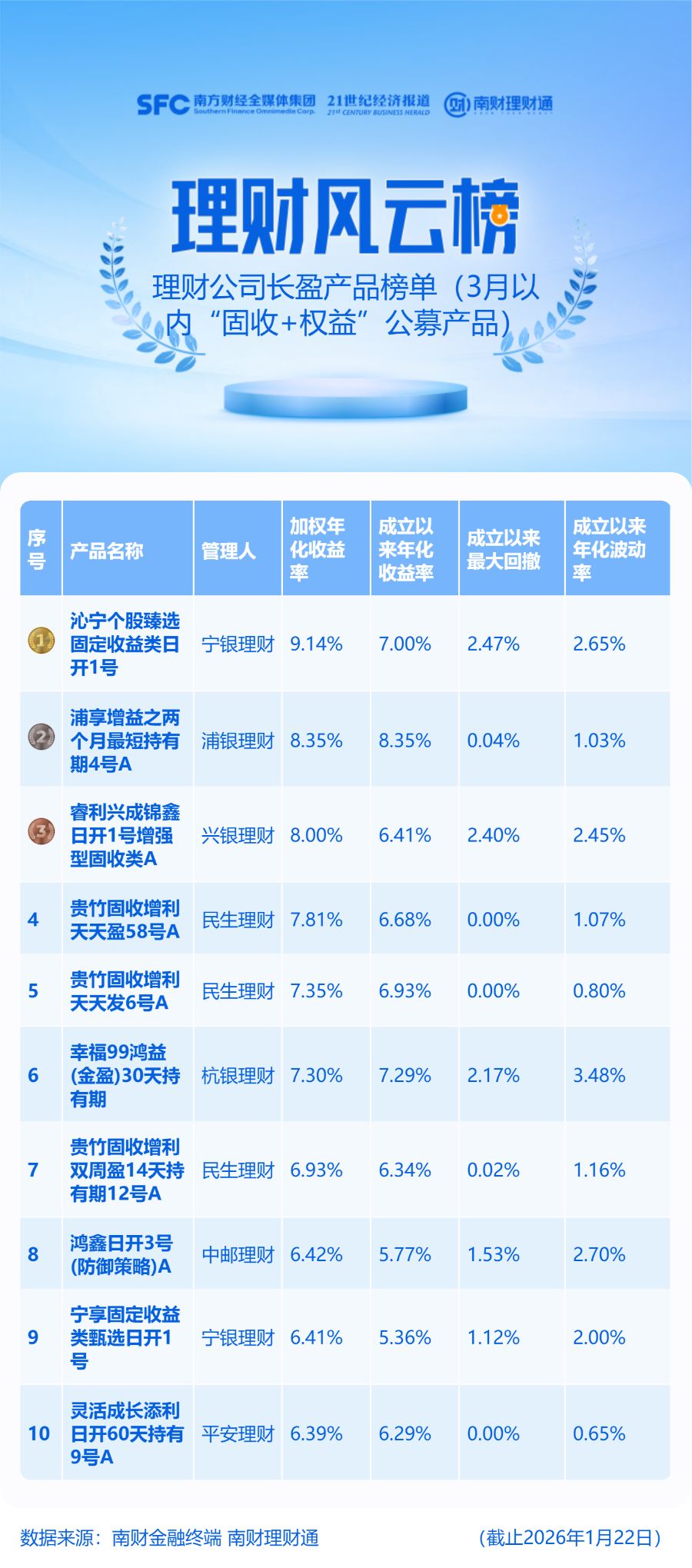 榜单数据说明:统计对象为理财公司发行的成立满1年的投资周期在3月以内(含)的公募固收+权益产品,同系列同投资周期产品保留一只,加权平均收益率计算方式为“5%近1月年化收益率+10%近3月年化收益率+15%近6月年化收益率+30%近1年年化收益率+40%成立以来年化收益率”,排名依据为加权年化收益率,数据计算截止时间为2026年1月22日。榜单排名由理财通AI全自动化实时排名,如您对数据有疑问,请在文末联系助理进一步核实。
