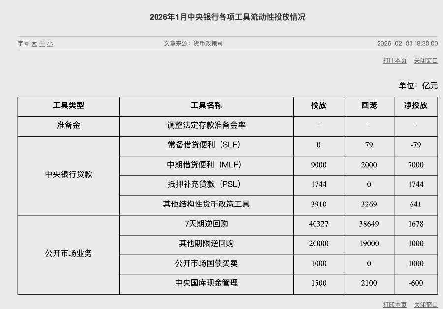 中国人民银行官网今天公布2026年1月中央银行各项工具流动性投放情况。数据显示,1月,中期借贷便利(MLF)净投放7000亿元,常备借贷便利(SLF)净投放-79亿元,其他结构性货币政策工具净投放641亿元。与此同时,公开市场操作方面,1月,公开市场国债买卖净投放1000亿元,7天期逆回购净投放1678亿元,中央国库现金管理净投放-600亿元,其他期限逆回购净投放1000亿元。