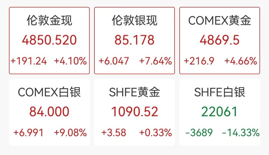 截至9:30,现货黄金站上4850美元,涨超4%;现货白银重回85美元,涨超7%。