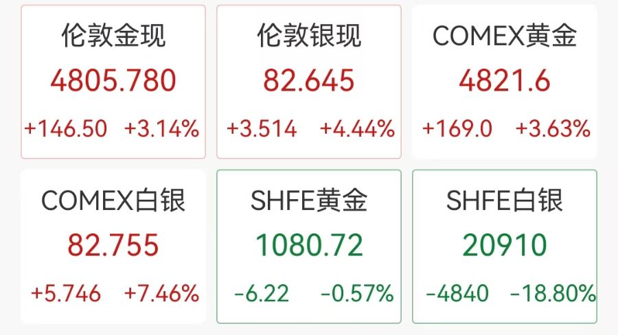 截至8:25,现货黄金向上触及4820美元/盎司,日内上涨超3%;现货白银日内涨幅超6%。