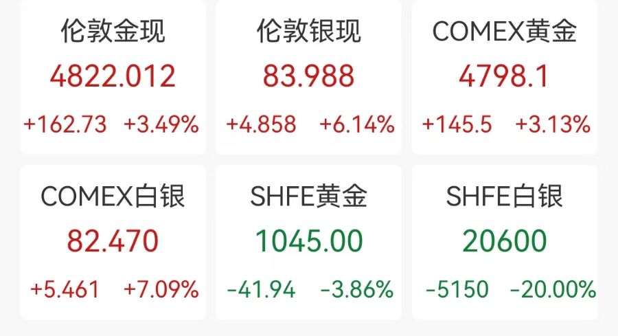 北京时间2月3日,国际黄金银价格开盘后双双反弹,现货黄金一度站上4850美元,现货白银一度涨超6% 。