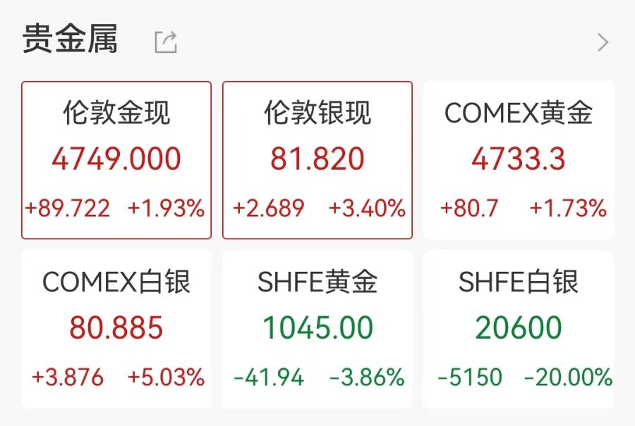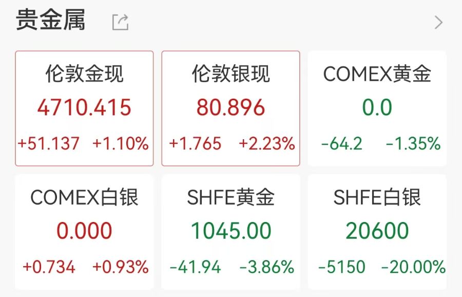 截至7:12,现货黄金向上触及4700美元,日内涨幅超1%;现货白银向上触及80美元/盎司,日内涨幅超2%。