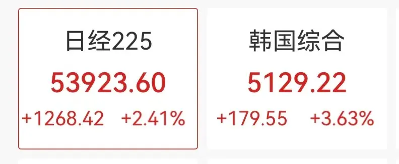 2月3日,日韩股市大幅高开。截至北京时间8:40,日经225指数涨超2.4%;韩国KOSPI指数涨超3.6%。韩国KOSPI 200期货上涨5%,程序化交易暂停5分钟。