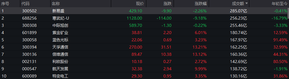 个股方面,新易盛成交额超285亿元居首,寒武纪-U、中际旭创、紫金矿业成交额靠前。