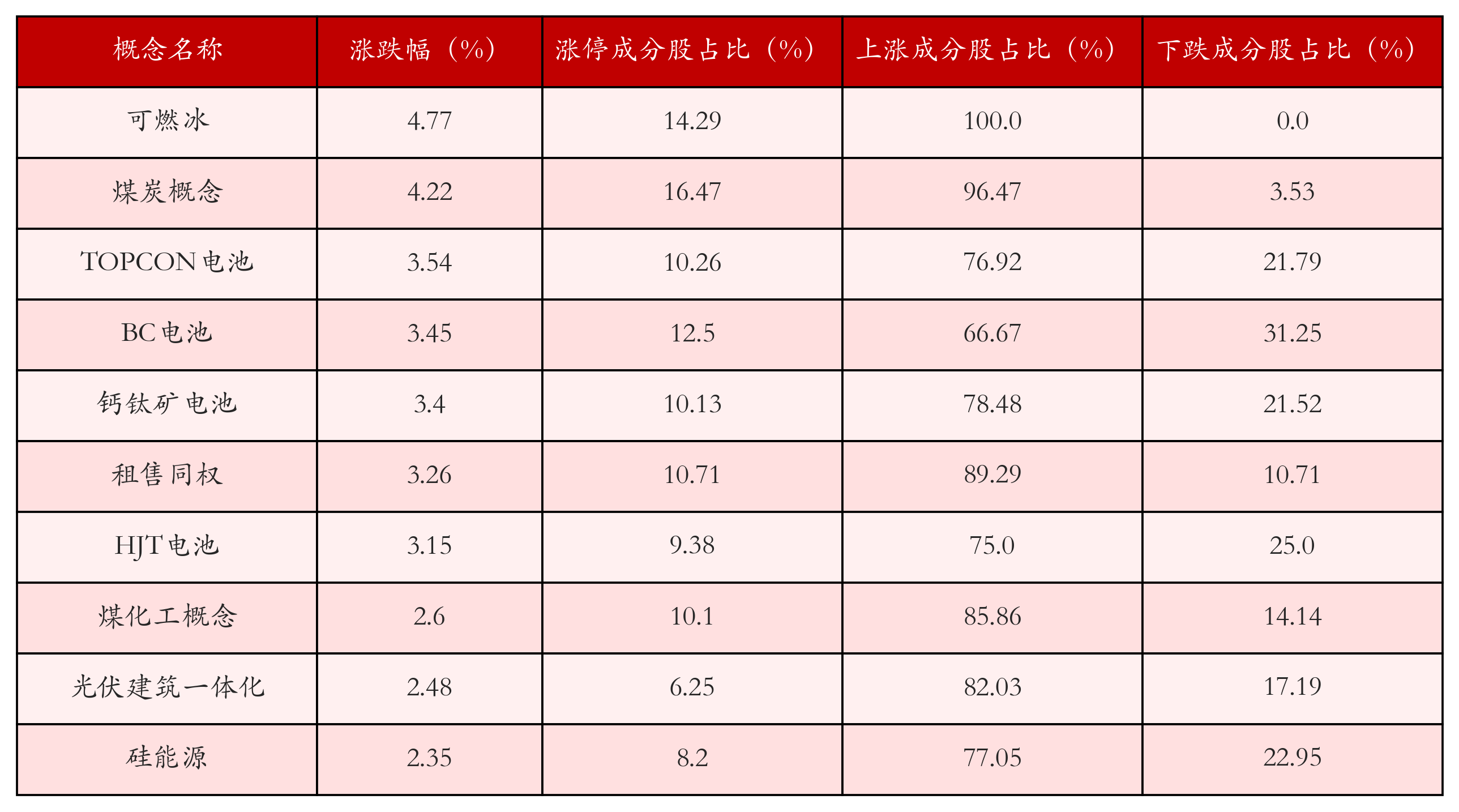 根据A股概念涨跌幅与所对应的股票池综合分析,涨幅靠前的三个概念板块分别为:可燃冰、煤炭概念与TOPCON电池。排名前10位的概念板块相关数据见下表: