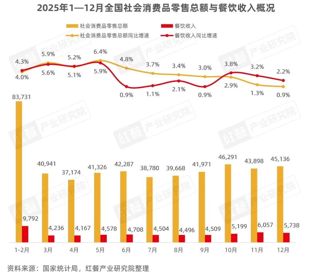 具体到第四季度,2025年第四季度餐饮收入为16,994亿元,在延续正增长的同时,增速有所放缓。国家统计局数据显示,2025年10月餐饮收入同比增长3.8%,11月和12月餐饮收入同比增速分别降至3.2%和2.2%。尽管季度内餐饮收入同比增速逐月回落,但整体仍高于同期全国社会消费品零售总额增速,显示餐饮消费在服务型消费中具备一定抗压韧性。