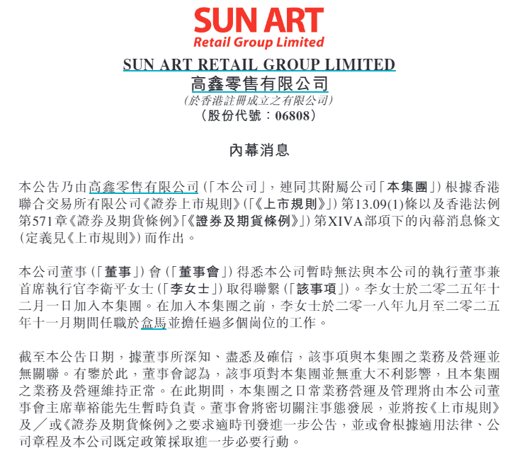 2月4日,大润发母公司高鑫零售(06808.HK)在港交所发布公告称,公司暂时与CEO李卫平无法取得联系。