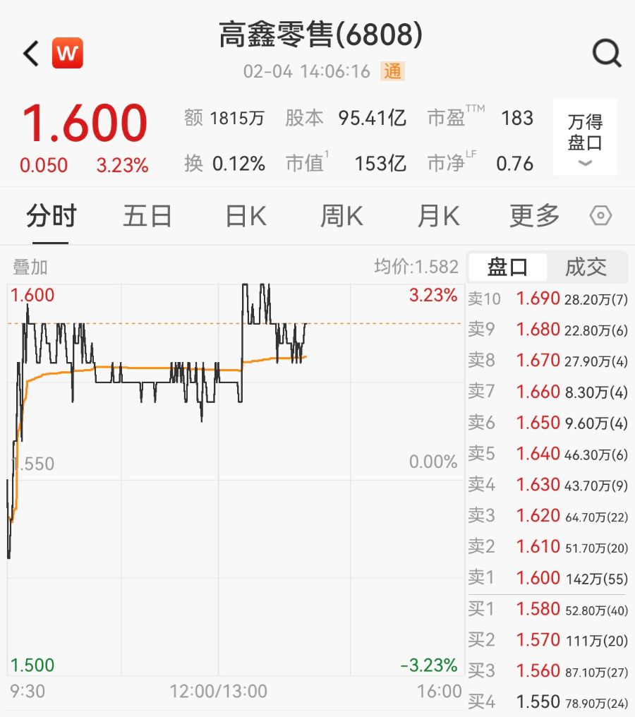 截至2月3日14时,高鑫零售报1.6港元/股,涨3.23%。