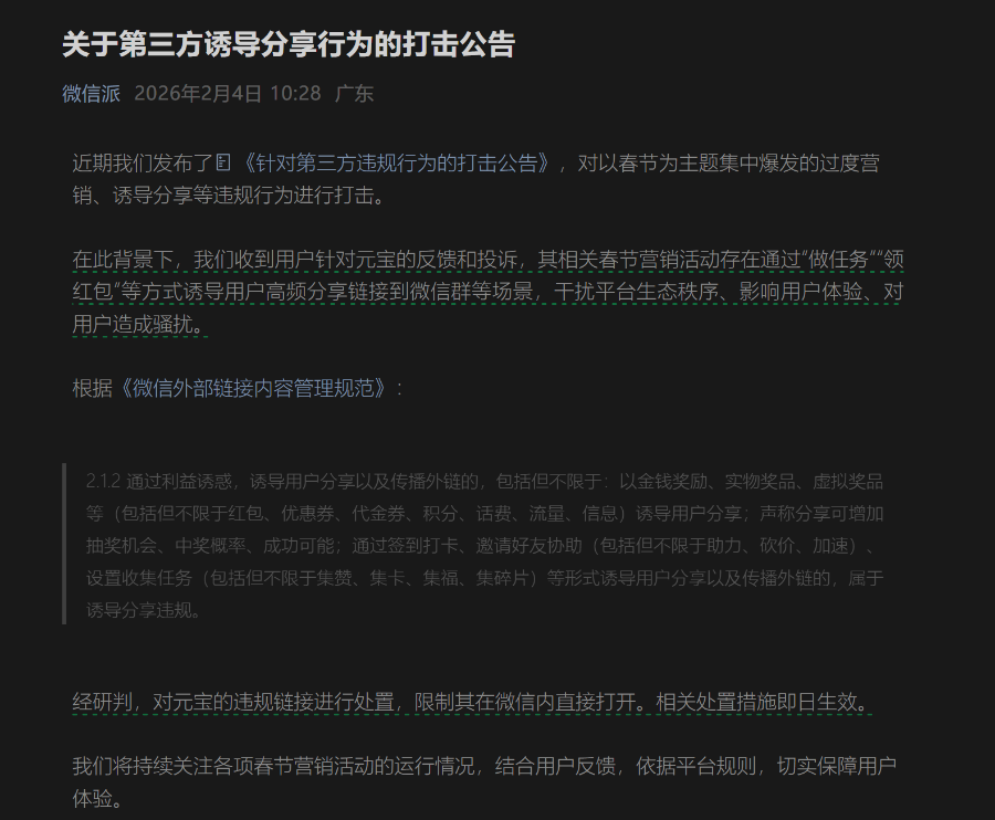 公告指出,在近期开展的春节主题过度营销、诱导分享的违规行为进行打击行动背景下,平台收到大量用户反馈,指“元宝”相关的春节营销活动利用“做任务”“领红包”等机制,诱导用户向微信群等场景高频分享链接。
