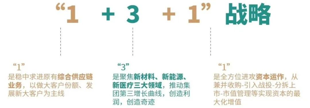 “1”即综合供应链业务,以核心企业(客户)为核心,完善物流、跨境等集成化服务体系,“3”代表新兴产业孵化,聚焦于新材料、新能源、新医疗等高增长领域。