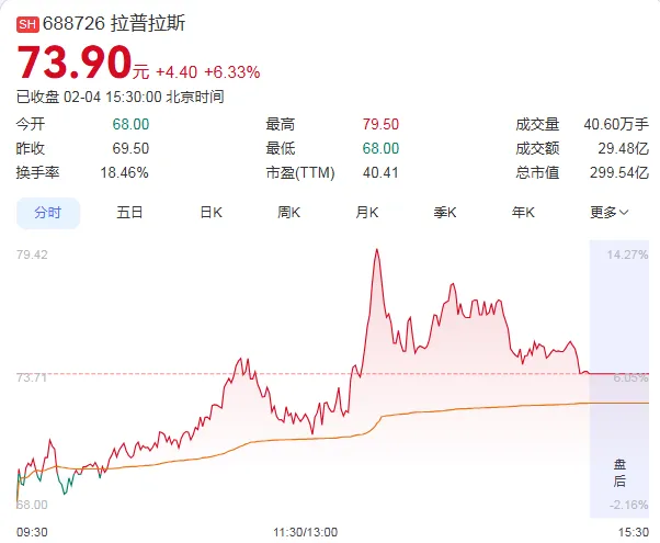 2月4日,拉普拉斯股价强势上涨6.33%,收盘价为73.90元,成交额为29.48亿元,总市值攀升至299.54亿元。据统计,自2026年1月5日以来的23个交易日内,拉普拉斯股价累计涨幅超过105%,表现非常亮眼。