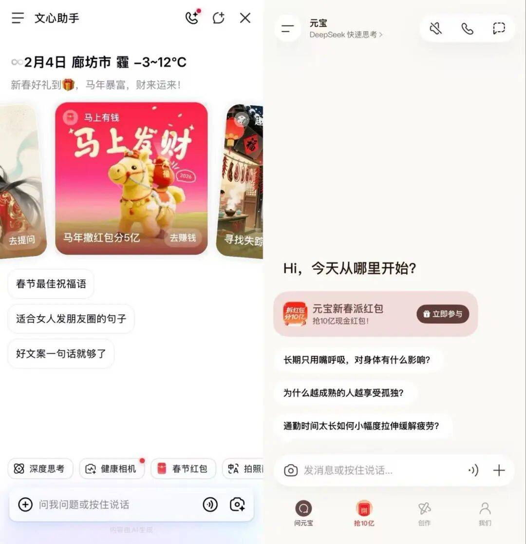 元宝狂撒10亿红包的同时,百度也说要在春节分5亿,红包任务融入到“文心助手”的近百种玩法之中。