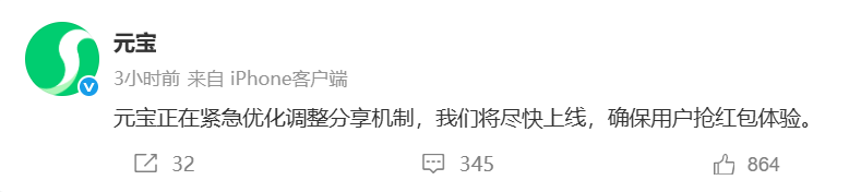 这事闹得越来越大,腾讯先是不得不出面回应。针对活动被质疑“诱导分享”,腾讯表示元宝红包基础逻辑为“无门槛领取”,用户不分享也能直接获得红包,分享仅用于增加抽奖机会,与恶意营销有本质区别。