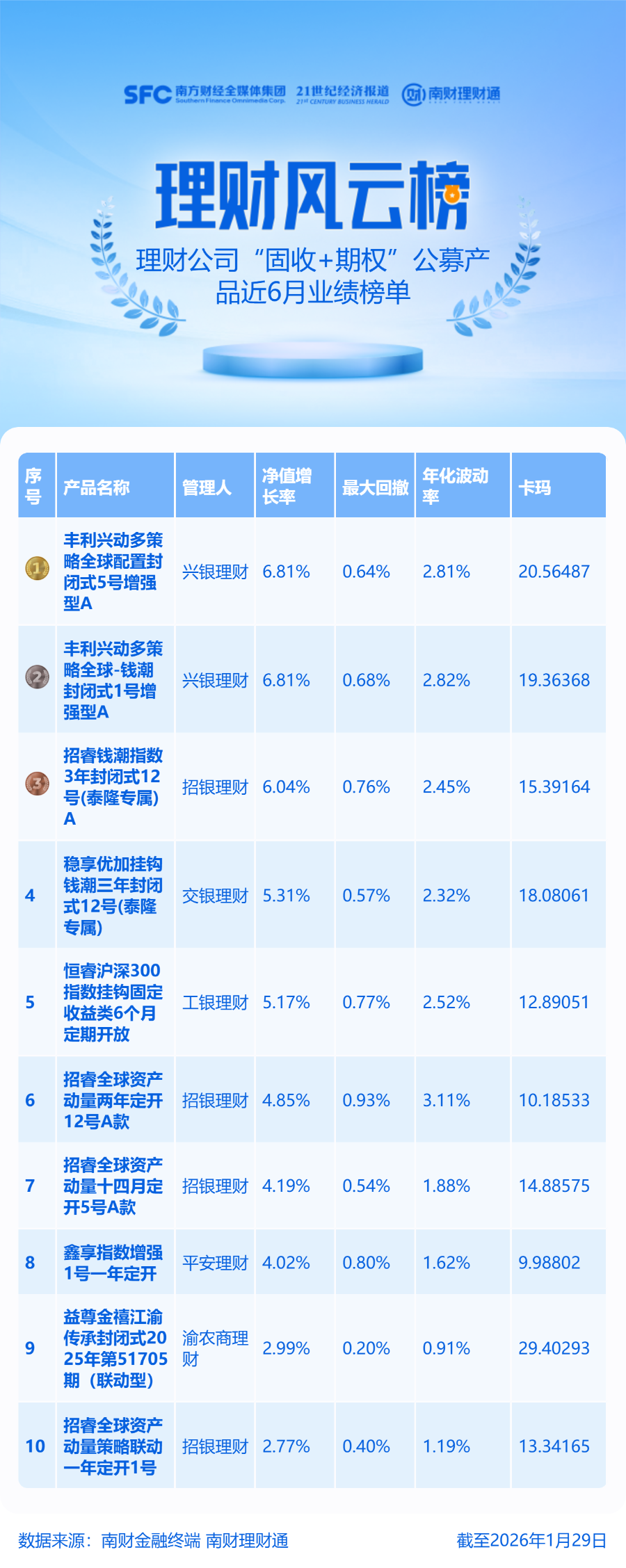 产品统计范围为理财公司发行的公募“固收+期权”理财产品,统计截止日期为2026年1月29日,统计区间为近6月。