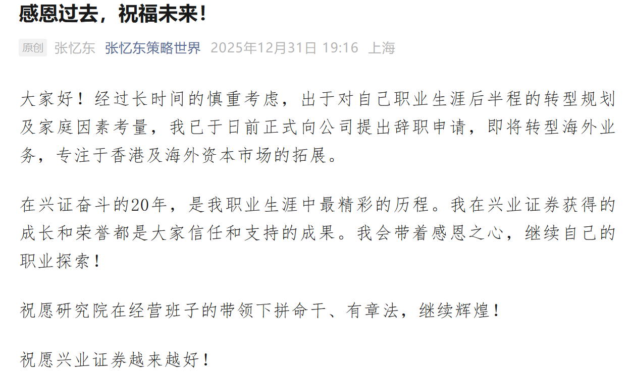 去年12月31日,张忆东在个人公众号“张忆东策略世界”发布声明称:“经过长时间的慎重考虑,出于对自己职业生涯后半程的转型规划及家庭因素考量,我已于日前正式向公司提出辞职申请,即将转型海外业务,专注于香港及海外资本市场的拓展。”