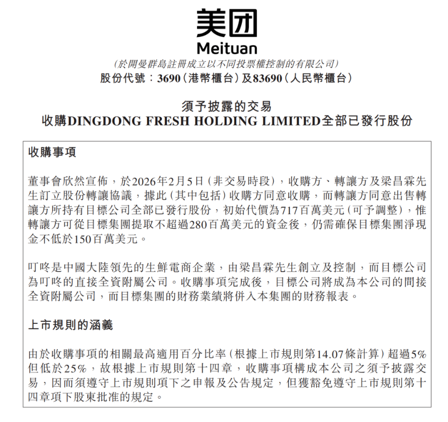2月5日盘后,美团在港交所最新公告,公司拟以7.17亿美元收购中国大陆领先的生鲜电商企业叮咚的全部已发行股份。根据协议,转让方可从目标集团提取不超过2.8亿美元的资金,但需确保目标集团净现金不低于1.5亿美元。