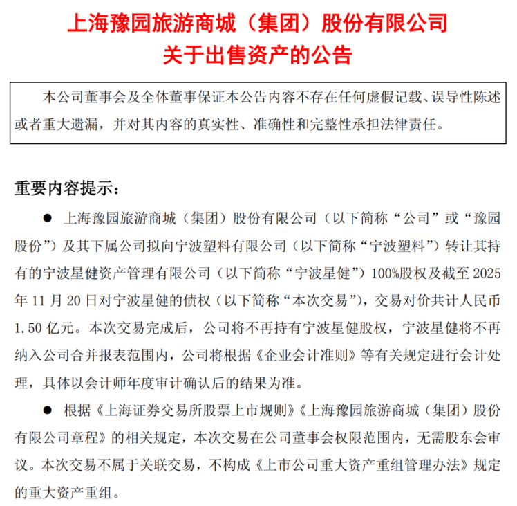 在12月17日,豫园股份一则公告引起市场关注:公司拟将宁波星健资产管理有限公司100%股权及相关债权,以1.5亿元总价转让给宁波塑料有限公司。