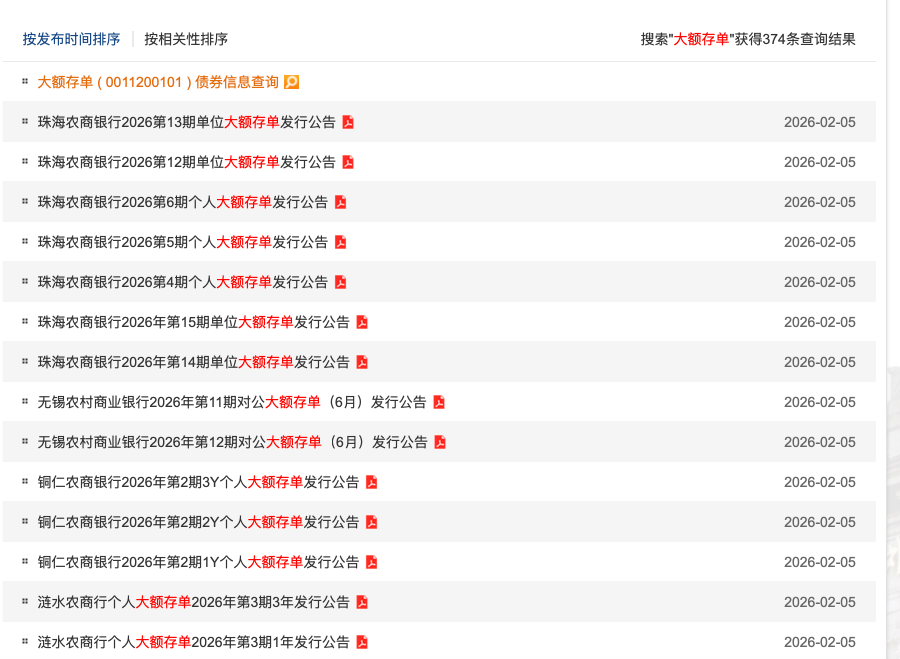 以珠海农商行为例,该行于2月5日一口气上线7期大额存单公告,涵盖3期个人大额存单和4期单位大额存单,合计发行规模达10.5亿元。具体产品信息如下: