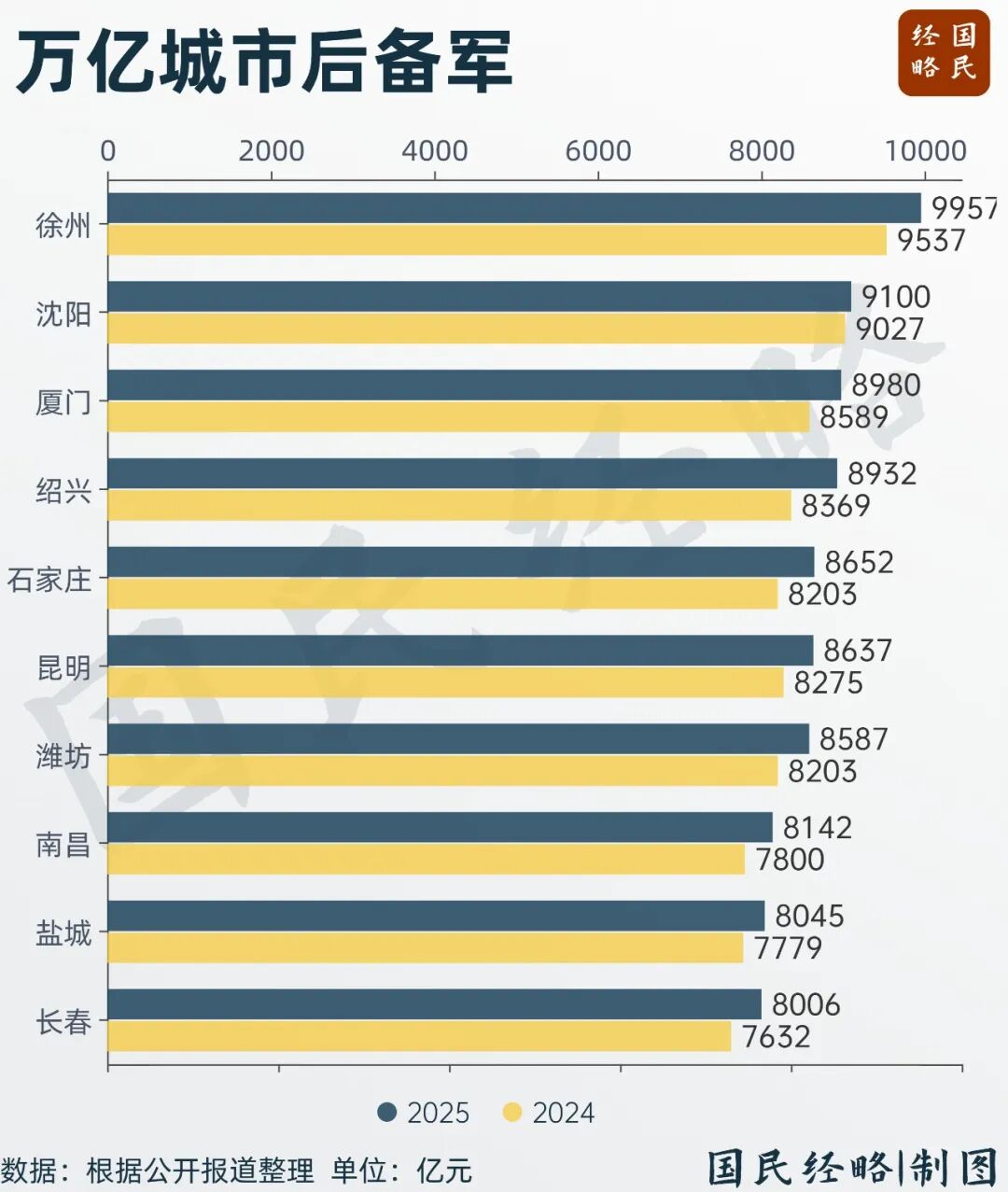 此外,9000亿级的沈阳,8500亿以上的厦门、绍兴、昆明、石家庄、潍坊,8000亿级的南昌、扬州、长春等地,都有望突破。
