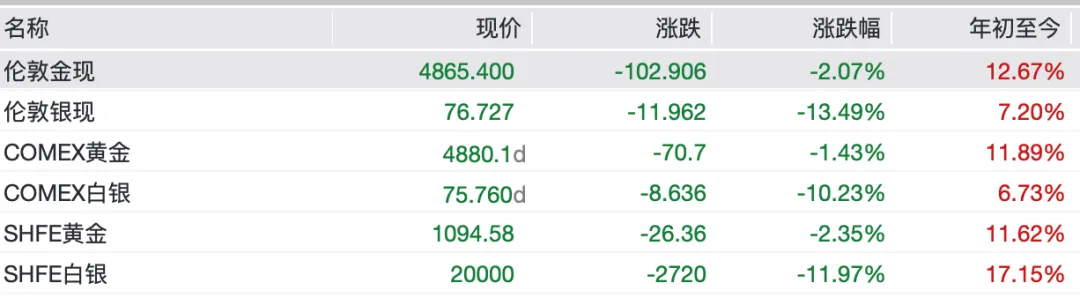 消息面上,国际金银价格盘中大跳水,截至北京时间11:49,现货白银重挫逾13%,跌破77美元关口,盘中最高一度触及89.56美元,SHFE白银同步大跌近12%;现货黄金日内跌超2%,价格从最高5023美元大幅下挫,最低价格一度至4788美元/盎司。