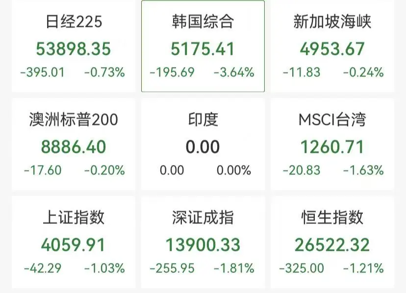 2月5日上午,亚太主要股指全线飘绿。A股三大指数、恒生指数均跌超1%,热门科网股多数下跌,华虹半导体跌超6%,腾讯控股跌超2.6%,市值跌破5万亿港元。韩国综合指数跌超3.6%,主要受SK海力士、三星电子拖累,其跌幅均超5%。