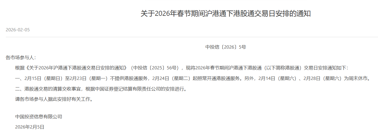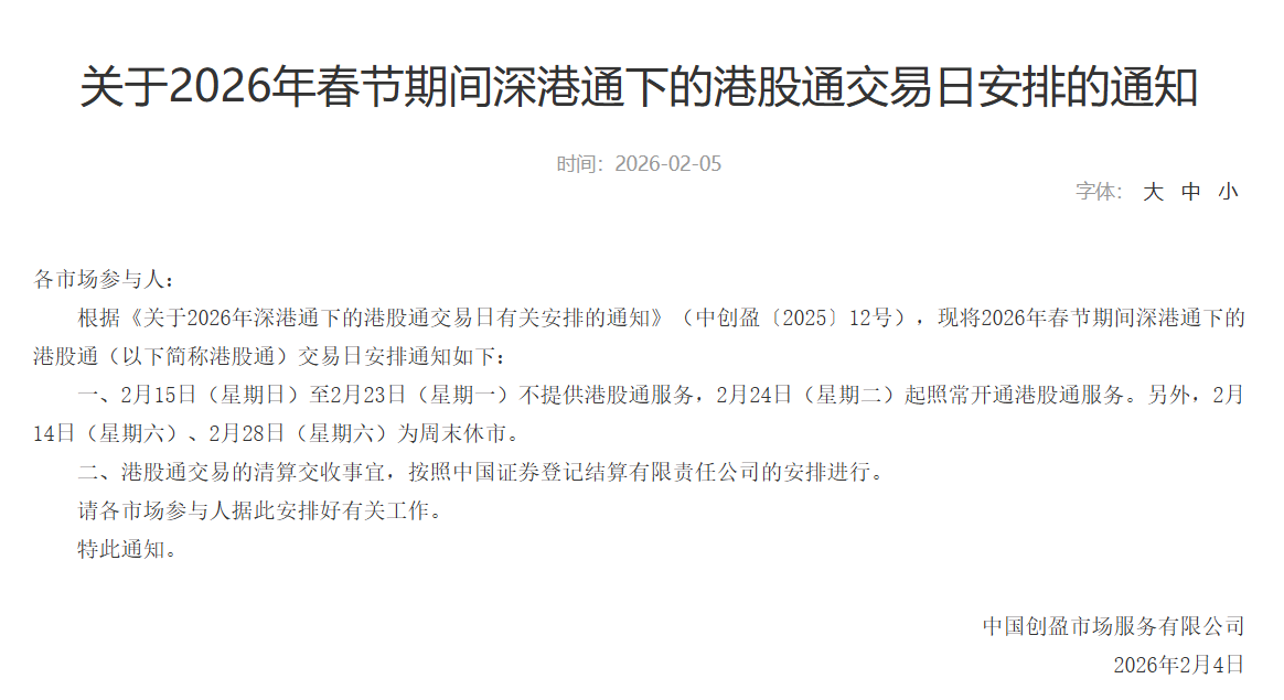 此外,2月5日,沪深交易所发布关于2026年春节期间港股通交易日安排的通知,2月15日(星期日)至2月23日(星期一)不提供港股通服务,2月24日(星期二)起照常开通港股通服务。另外,2月14日(星期六)、2月28日(星期六)为周末休市。