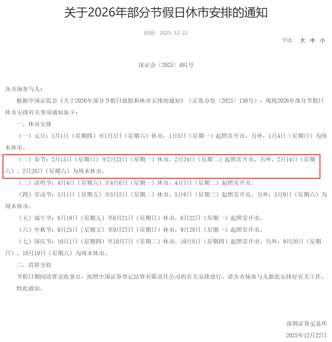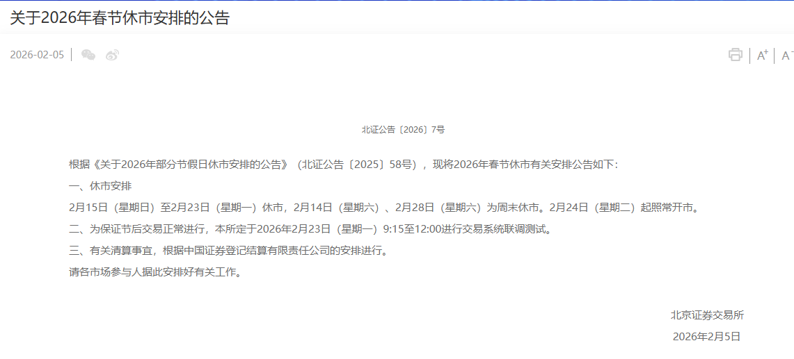 截至2月5日,上交所、深交所、北交所均已公布2026年春节休市安排:
