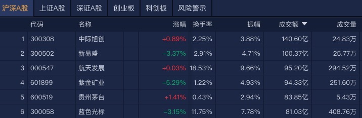 沪深两市半日成交额1.45万亿,较上个交易日缩量1682亿。个股上,中际旭创半日成交额超140亿元居首,新易盛成交额超100亿元,航天发展、紫金矿业、贵州茅台等成交额排名靠前。