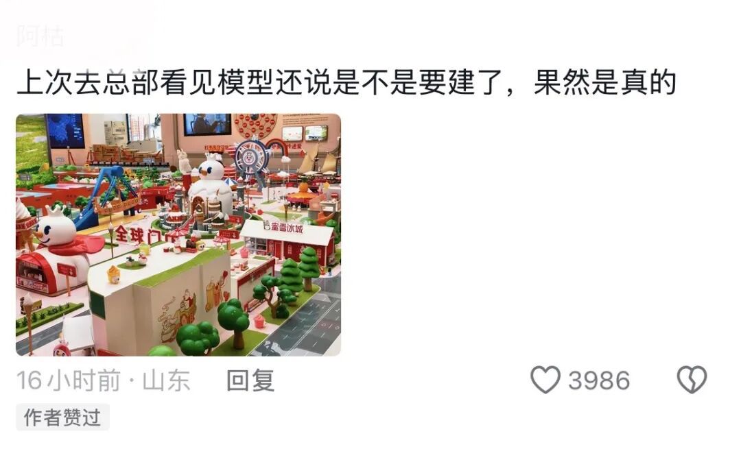 也就是说,蜜雪做乐园,大概率不会走迪士尼、环球的高端路线,而是会延续它的平价基因:低价门票,里面的奶茶、冰淇淋还是3块、5块,周边产品也卖平价,主打“人人都玩得起”。这种模式,刚好填补了下沉市场的空白——本地人周末遛娃、朋友小聚,花几十块钱就能逛乐园、喝奶茶,性价比拉满;外地人去打卡,既能玩,又能买平价周边,还能发朋友圈,何乐而不为?