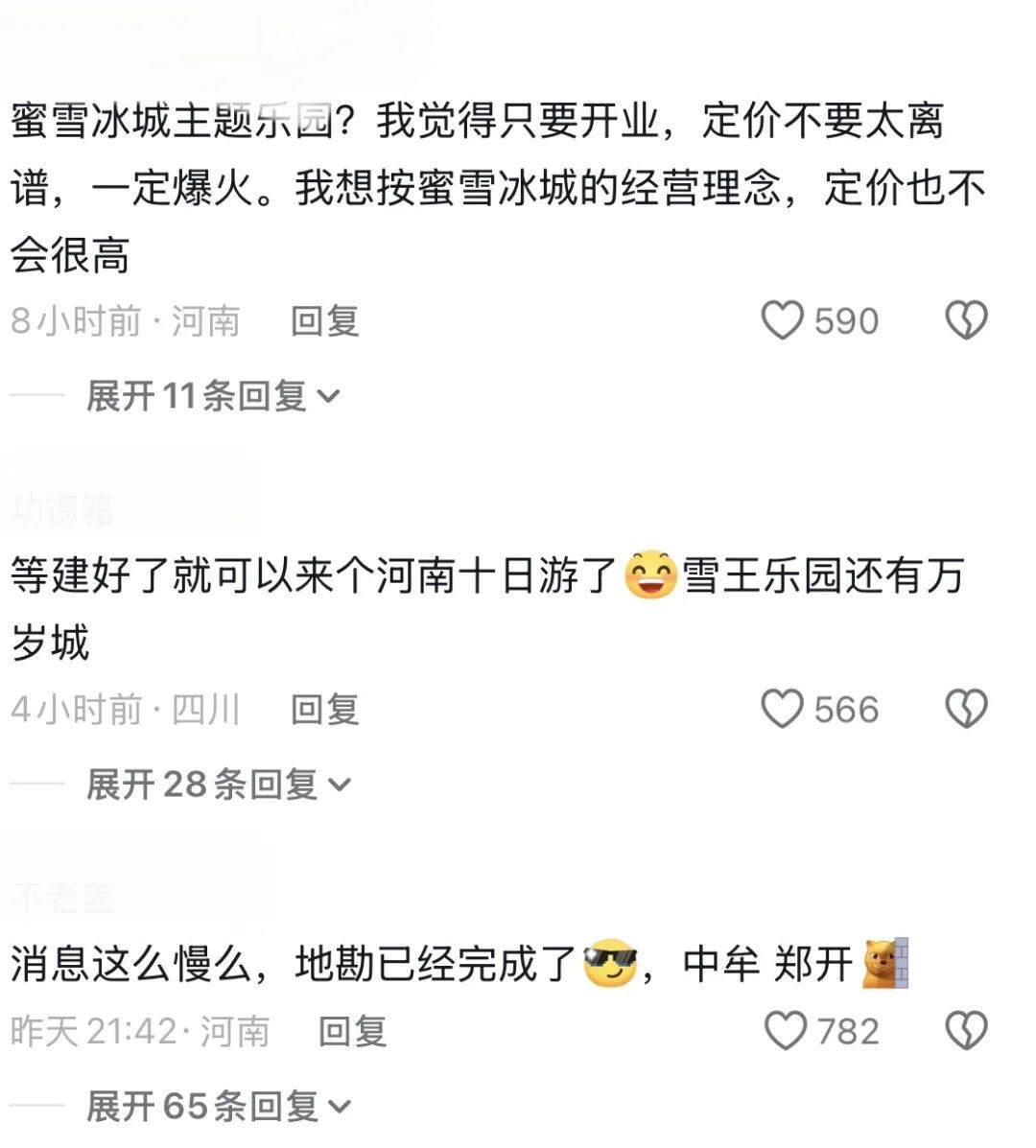 对此网友讨论颇多,有人说蜜雪冰城卖3块钱冰淇淋居然也敢做主题乐园?也有人爆料说中牟地勘已完成,目前官方只是含糊地说并不清楚具体事宜,且已将情况反馈给相关人员。