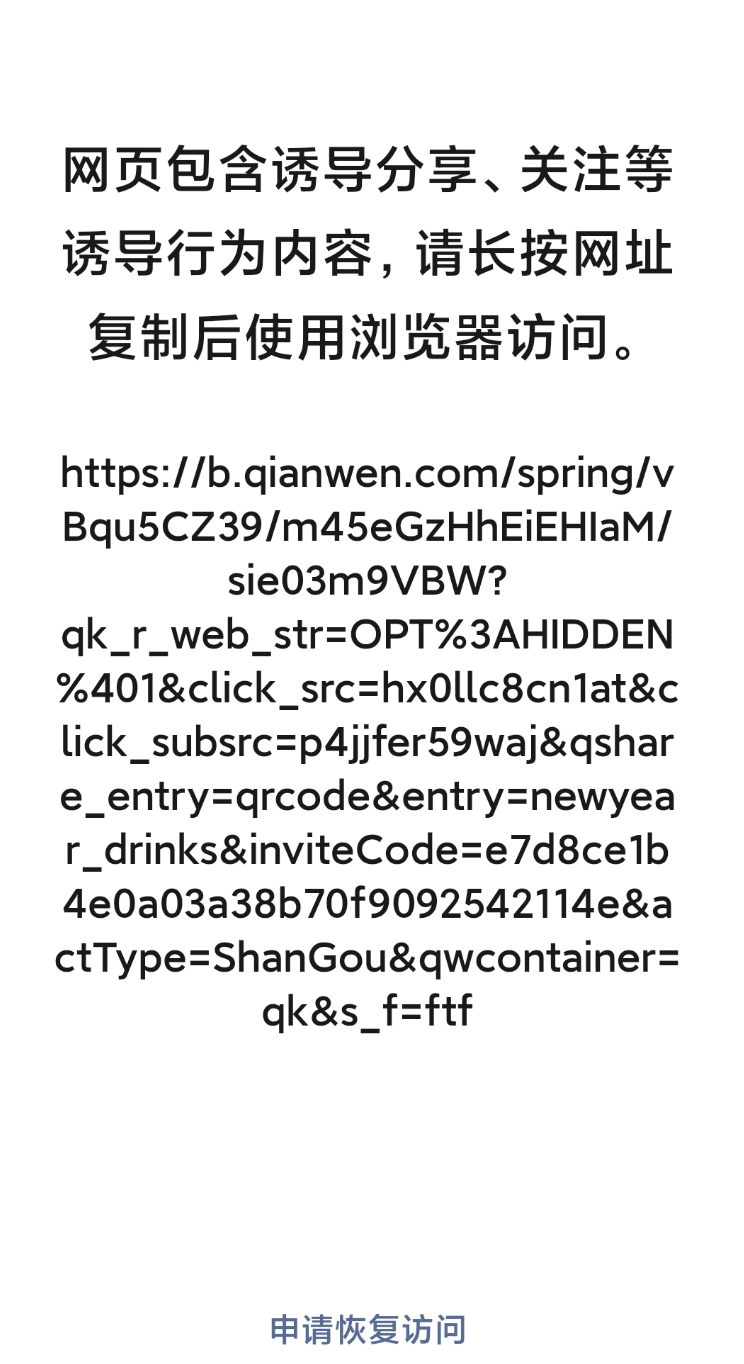 不过,截至目前,千问分享到微信群的二维码链接,已被微信封禁。界面显示,网页包含诱导分享、关注等诱导行为内容,请长按网址复制后使用浏览器访问。