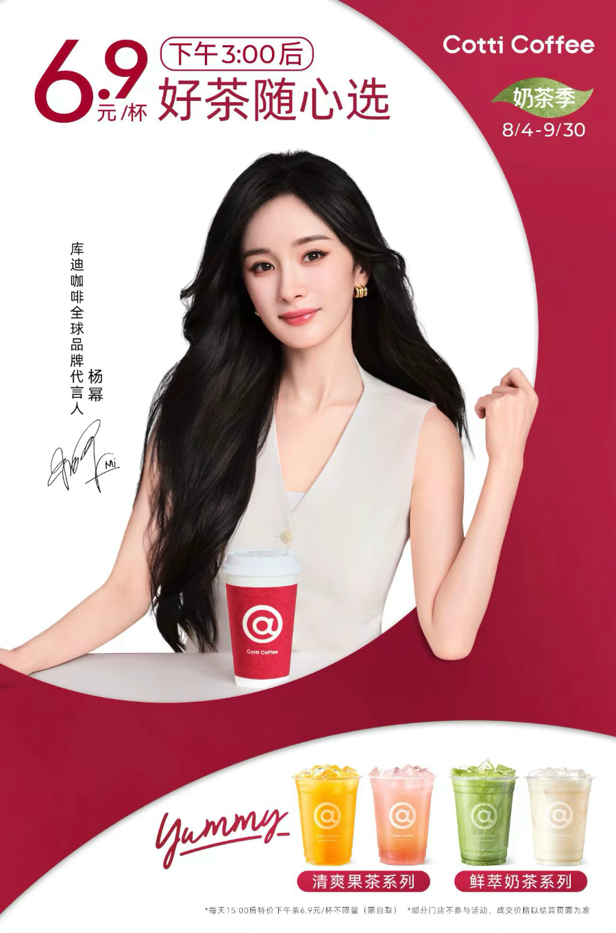 库迪也在趁热打铁。在2025年8月4日起至9月30日,该公司同步启动“奶茶季”营销活动,每日15点后全场茶饮6.9元不限量。
