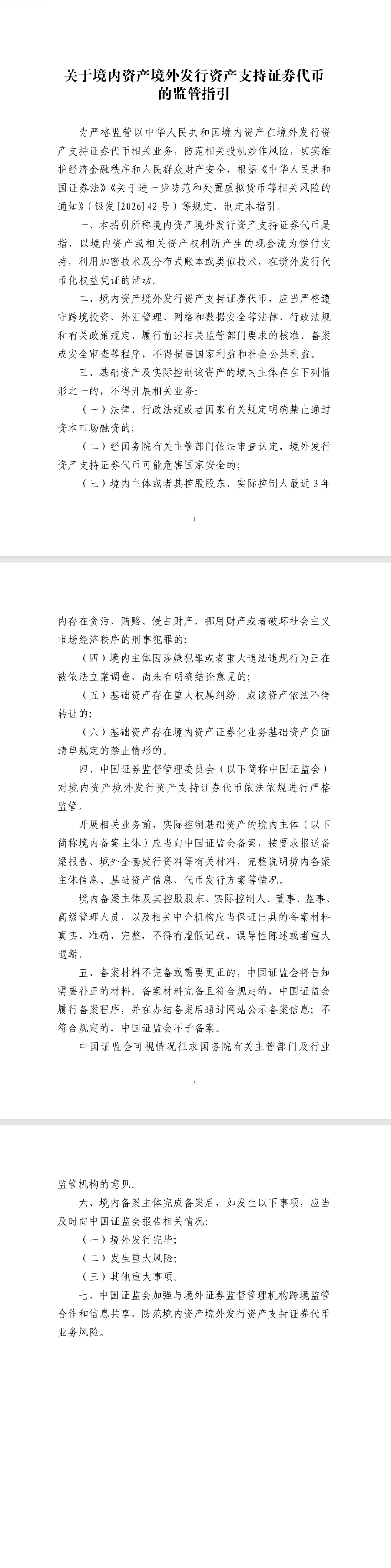 2月6日,证监会发布《关于境内资产境外发行资产支持证券代币的监管指引》。指引所称境内资产境外发行资产支持证券代币是指,以境内资产或相关资产权利所产生的现金流为偿付支持,利用加密技术及分布式账本或类似技术,在境外发行代币化权益凭证的活动。境内资产境外发行资产支持证券代币,应当严格遵守跨境投资、外汇管理、网络和数据安全等法律、行政法规和有关政策规定,履行前述相关监管部门要求的核准、备案或安全审查等程序,不得损害国家利益和社会公共利益。