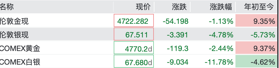 2月6日,黄金白银直线跳水,截至北京时间7:50左右,现货白银跌超5%,在67美元/盎司附近震荡,昨日收跌逾20%,回吐年初至今涨幅,较1月29日创下的历史高点回落逾40%。现货黄金跌超1%,跌至4722美元/盎司关口。(回顾详情)