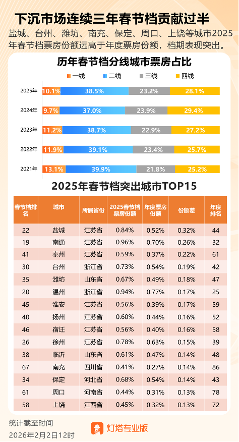 从地域分布角度来看,下沉市场仍是影响春节档格局的重要因素。灯塔专业版数据显示,三四线城市已连续三年在春节档贡献出过半票房。“山河四省”(山西、河南、山东、河北)及苏皖赣地区依旧是春节档兵家必争之地。数据显示,江苏省因盐城、南通、泰州等多个地级市的强劲表现,已五年蝉联春节档省份票房冠军。