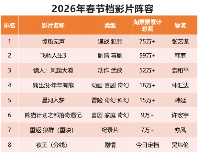 2月6日,灯塔专业版发布《2026年春节档前瞻》。截至目前,已有8部影片定档2026年春节档。从 “想看”数据来看,《惊蛰无声》《飞驰人生3》《镖人:风起大漠》构成头部主力阵营,《熊出没·年年有熊》《星河入梦》及《熊猫计划之部落奇遇记》则各守类型基本盘。灯塔专业版前瞻分析认为,2026年春节档电影市场或从2025年春节档的“一超多强”回归“多强争霸” 格局。