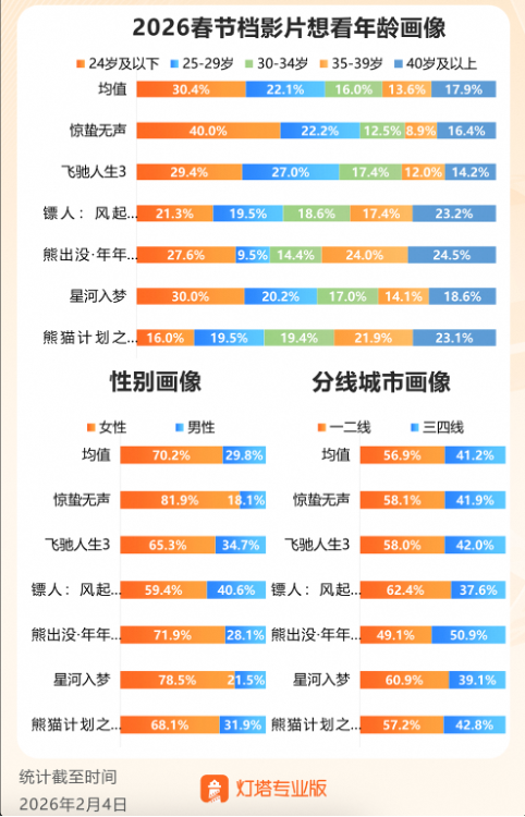 灯塔专业版前瞻数据显示,春节档新片受众差异显著:《惊蛰无声》年轻及女性观众想看占比突出;《镖人:风起大漠》更吸引男性观众;《熊出没·年年有熊》三四线城市“想看”占比断层领先;《飞驰人生3》和《熊猫计划之部落奇遇记》则分别是25—29岁和40岁以上观众想看占比最高的影片。