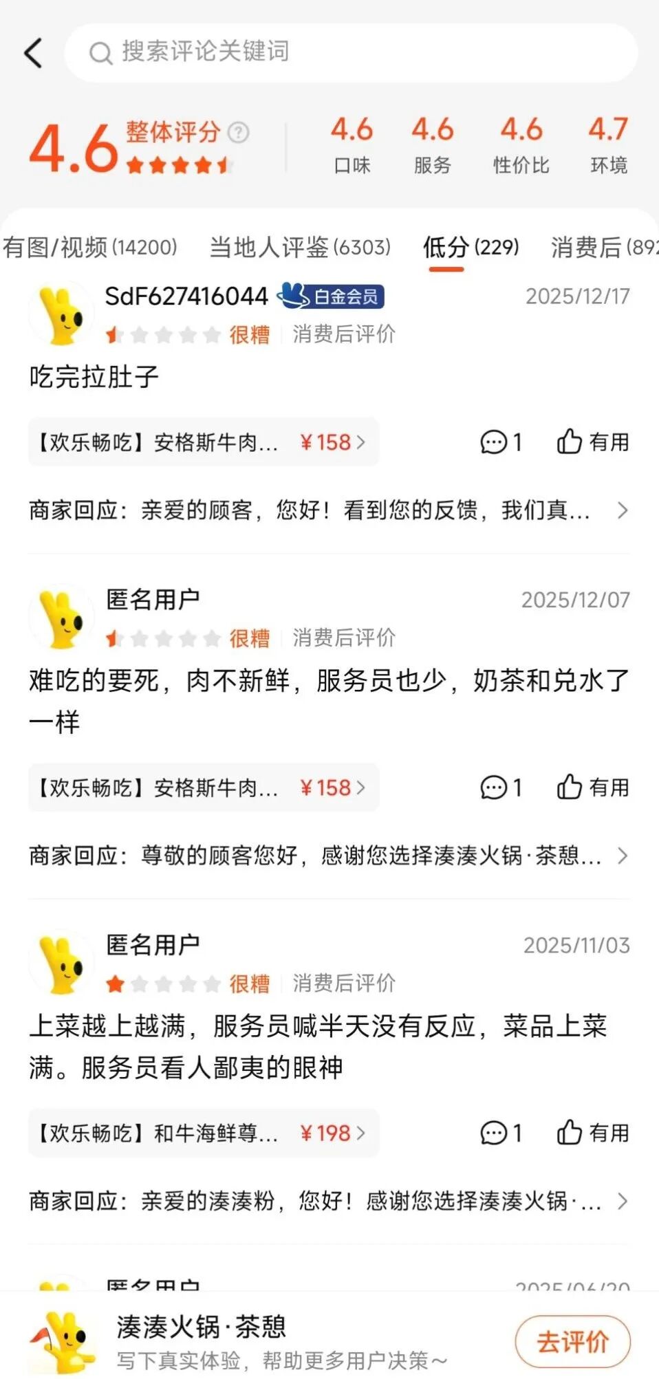 在美团等平台上,“价格贵”“菜量少”“服务差”“不卫生”已成为消费者对湊湊火锅的普遍吐槽。在黑猫投诉上,关于呷哺呷哺和湊湊火锅的投诉分别超830条和80条。投诉内容包括“吃完火锅拉肚子”、服务和充值问题等。
