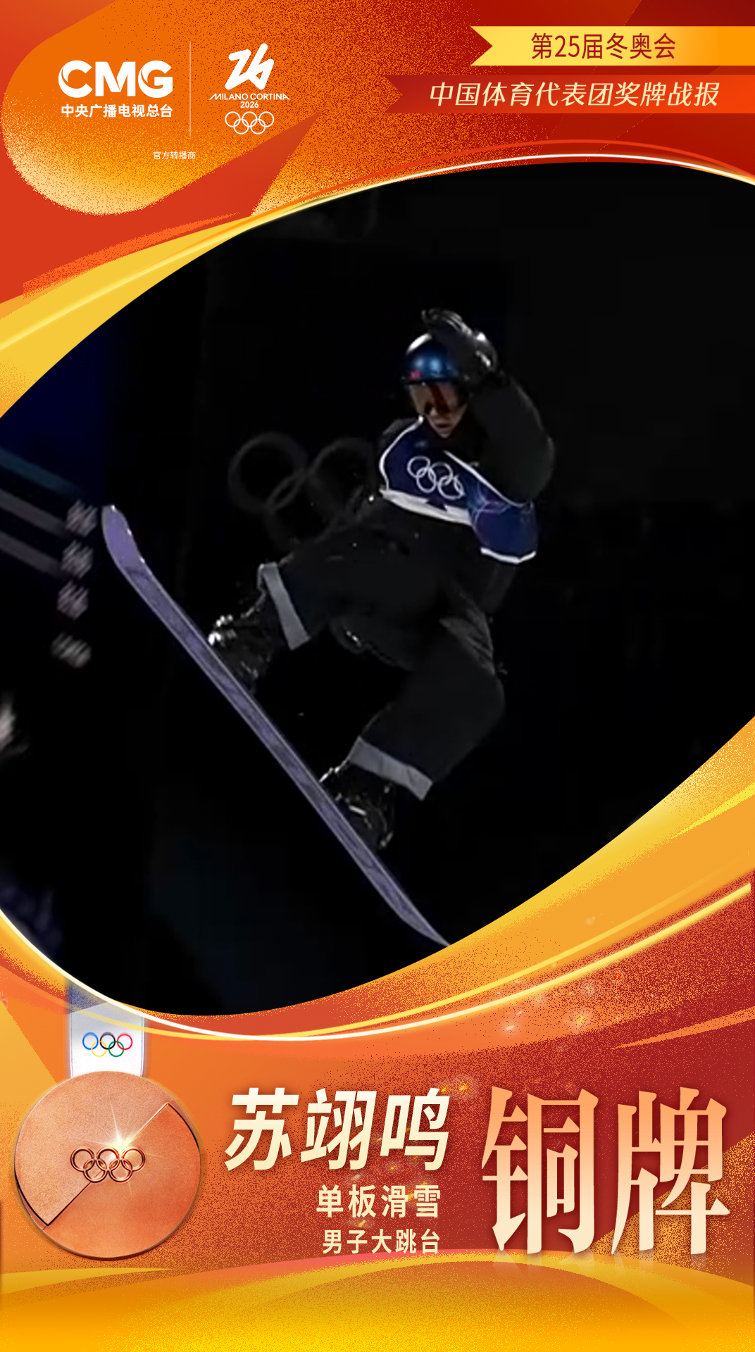 北京时间2月8日,在米兰-科尔蒂纳冬奥会单板滑雪男子大跳台决赛中,中国选手苏翊鸣获得铜牌,这是中国体育代表团在本届冬奥会获得的首枚奖牌。