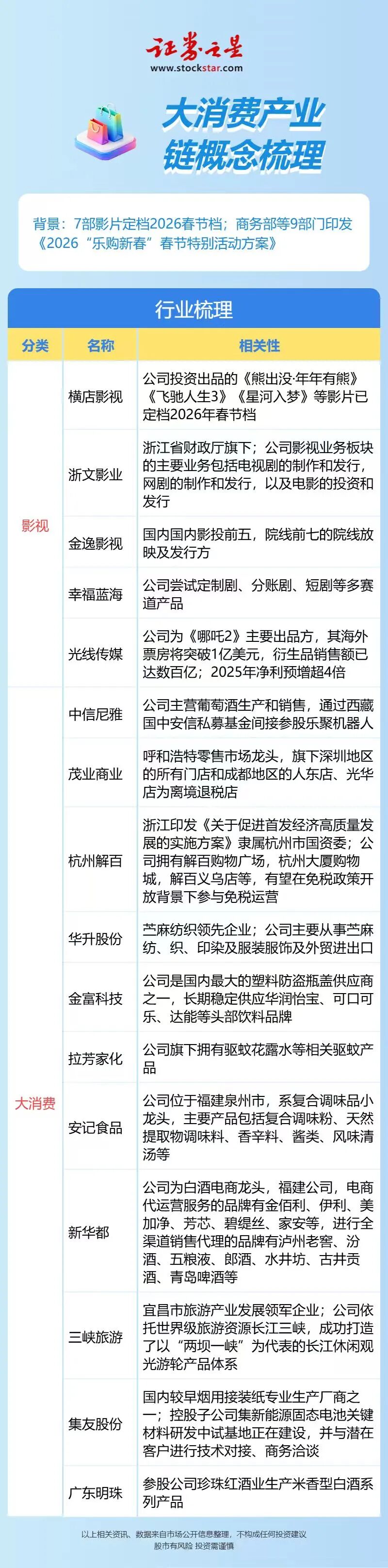 背景:7部影片定档2026春节档;商务部等9部门印发《2026“乐购新春”春节特别活动方案》。