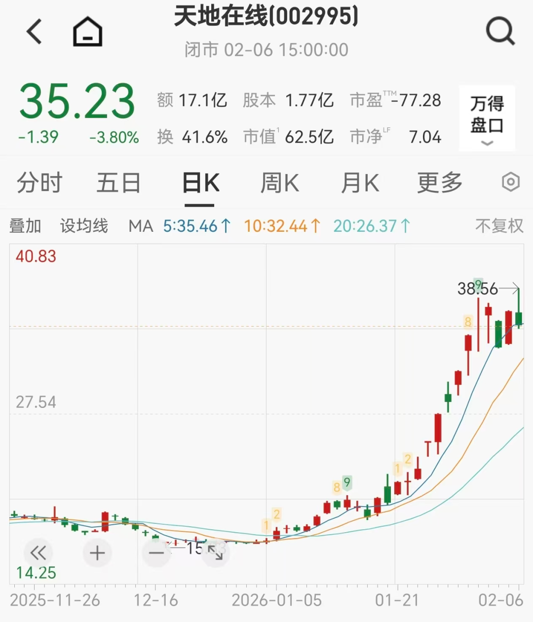资本市场上, 李亚鹏带火的翻倍牛股天地在线近期大幅波动 ,2月6日盘中再创新高后转跌,换手率达41.6%。(详情>>)