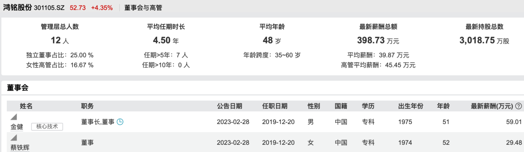 Wind数据显示,鸿铭股份高管平均年龄48岁,平均薪酬39.87万元,董事长金健薪酬约59万元。